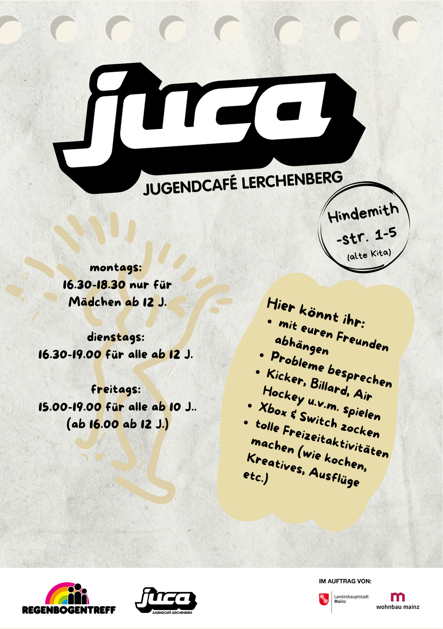 Das Jugendcafé JUCA ist seit über 20 Jahren eine zentrale Anlaufstelle für Kinder und Jugendliche auf dem Mainzer Lerchenberg. In enger Kooperation mit der Stadt Mainz und zahlreichen Partnern bietet die Stiftung Juvente hier ein vielfältiges, pädagogisch begleitetes Angebot – direkt im Stadtteil, mitten im Leben.