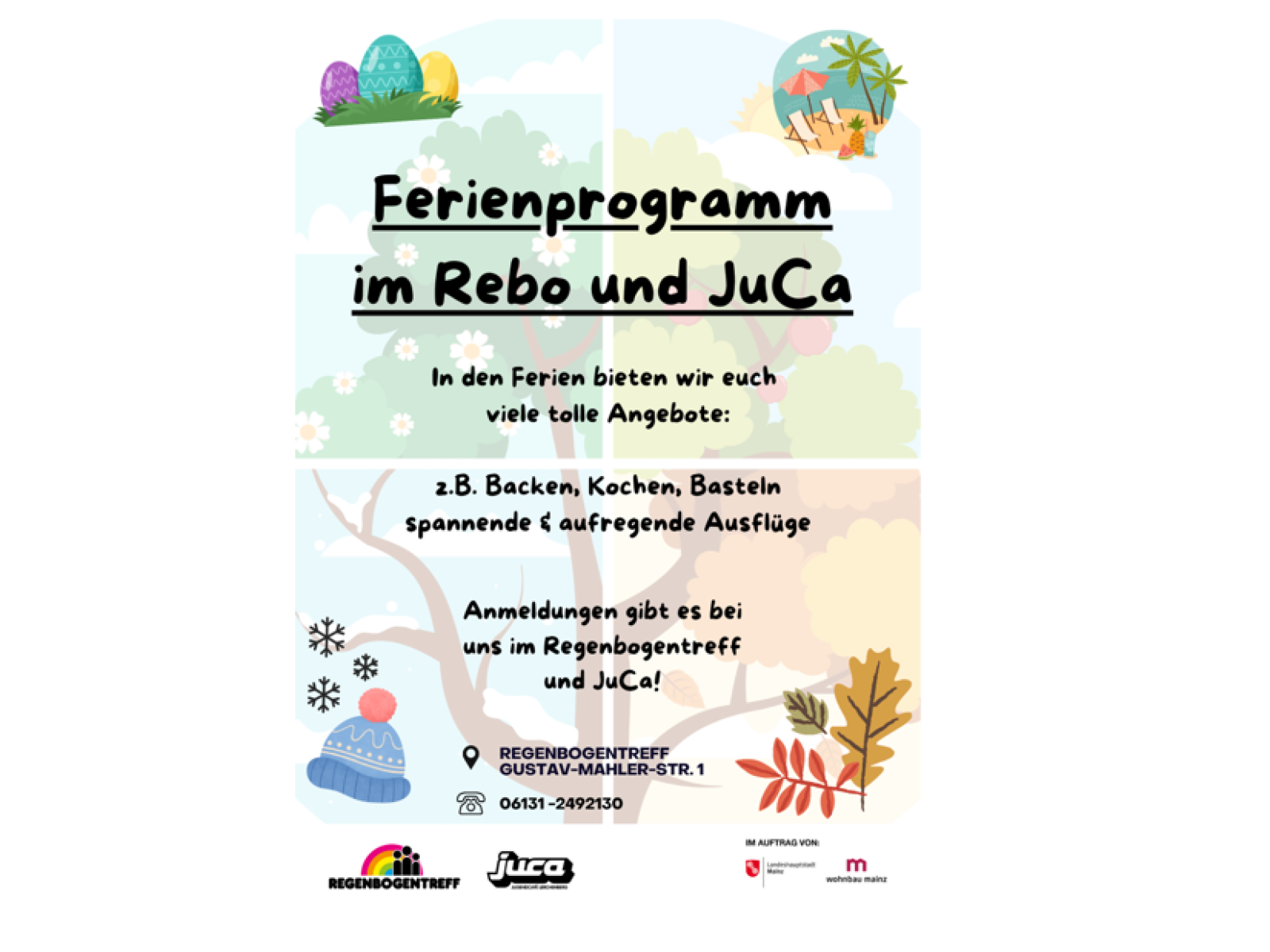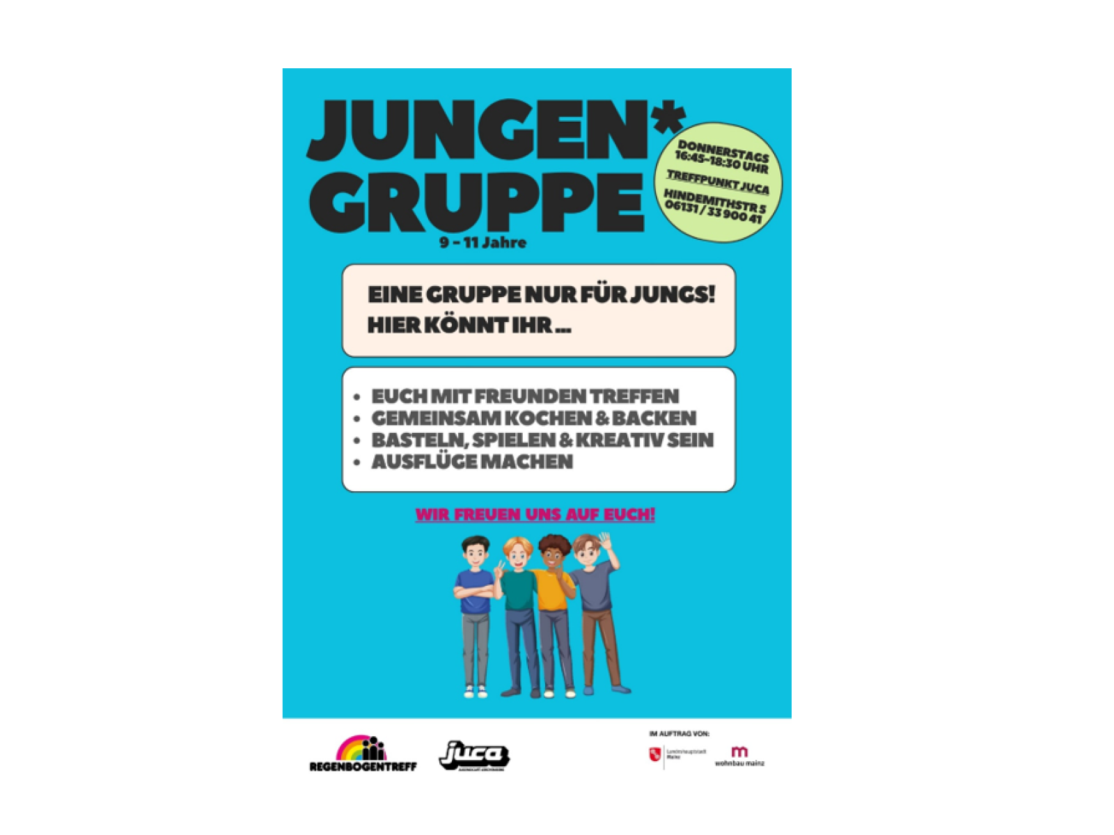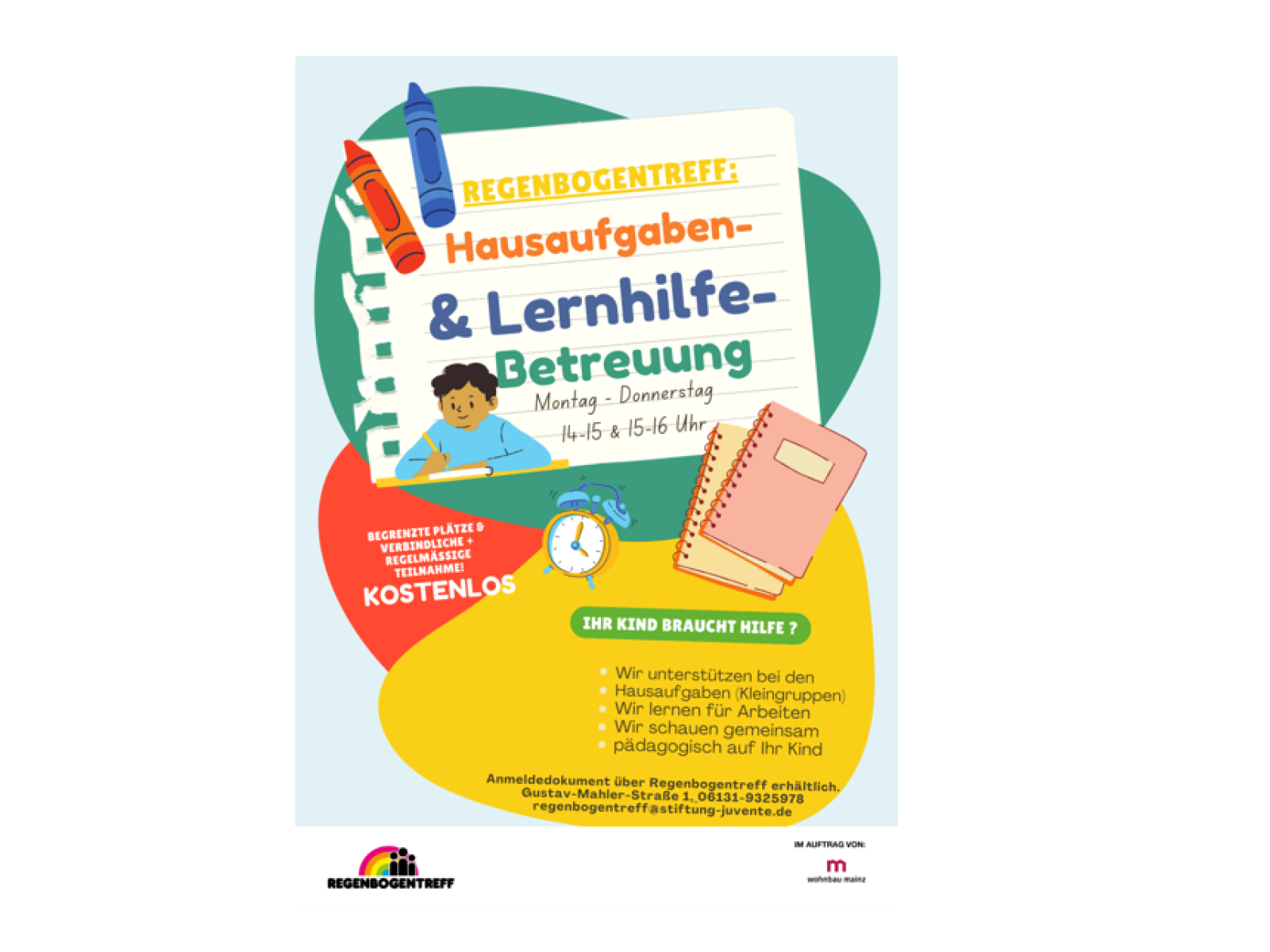 Mit dem Regenbogentreff betreibt die Stiftung Juvente Mainz seit über 20 Jahren eine lebendige und niedrigschwellige Gemeinwesenarbeit auf dem Mainzer Lerchenberg. In enger Kooperation mit der Wohnbau Mainz, sowie zahlreichen Partnern aus dem Stadtteil, bieten wir Kindern, Jugendlichen und Erwachsenen ein vielfältiges, pädagogisch begleitetes Angebot – direkt vor Ort, mitten im Quartier.